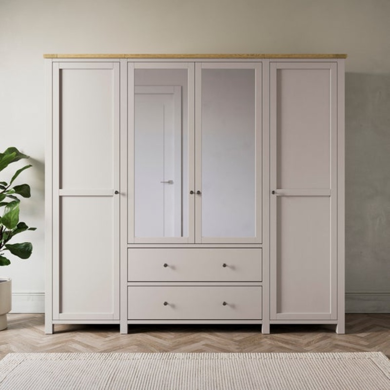 Dunelm Exclusive - Designed and Developed by DunelmAmple Storage SpaceIncludes 2 Drawers, 1 Internal Shelf, 5 Clothes Rails & 4 DoorsBrushed Metal Brass HandlesHigh Quality Fittings and HingesStrong and Stable ConstructionThis spacious wardrobe offers ampl