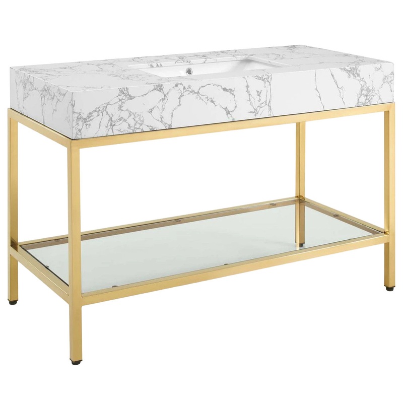 Channel opulence with the glam deco Osage Brushed Gold Stainless Steel Artificial Marble Bathroom Vanity. The Osage Bathroom Vanity introduces a royal style to your bathroom with the artificial marble curved basin and gold metal accents. Resting on a brushed gold stainless steel frame, the Osage 8-Inch Centerset Bathroom Vanity features a modern glass shelf for storing all your bathroom essentials and rests on non-marking foot caps to protect flooring. Assembly required, fixtures not included.