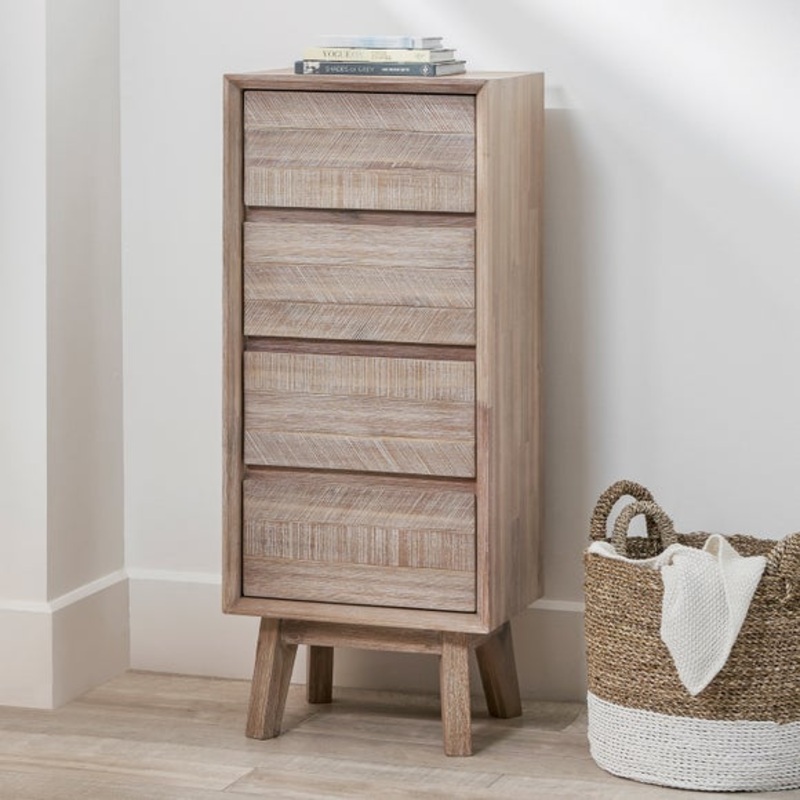 Acacia woodClean lined finishScandi styleSubstantial and sturdyYour smaller bedroom space shouldn't miss out on storage opportunities, so use this slim 4 drawer chest to help with just that. You will have more room to store all your bits and bobs away to k