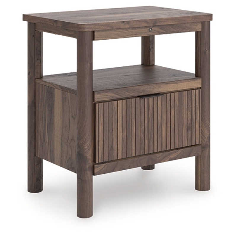 Crafted with both form and function in mind, this nightstand brings a dash of retro-cool character to your modern boho aesthetic. Reeded accents add an on-trend touch to its classic silhouette. Warmly welcoming with a rich brown finish, this piece pairs well with muted hues, earth tones and other neutrals alike. Need a charge? Handy USB ports keep phones, e-readers and tablets charged while you scroll before bed. What a refined take on easygoing style.