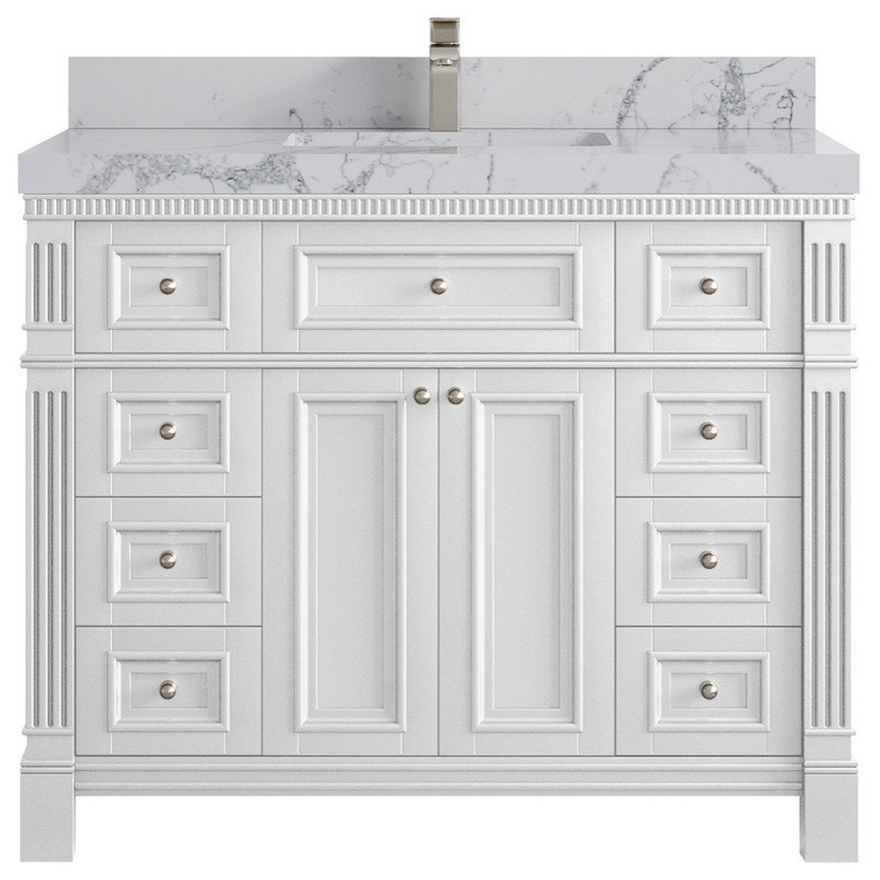 Willow Collection Paris 42 x 22 Single Sink Bath Vanity in White with 2" Straight/ Mitered Edge Venatino Quartz The Paris Collection is a stunning bathroom vanity that exudes artistry and quality craftsmanship. This premium vanity is made from solid Birch