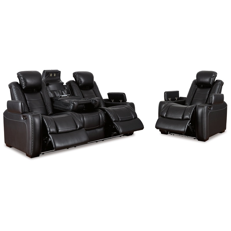 This power reclining sofa and recliner set takes its cue from luxury automobiles with lattice- and cross-hatch stitching, for a richly tailored aesthetic that gives you plenty of reasons to celebrate. Sumptuously padded cushions and dramatic midnight black faux leather upholstery add to the indulgence. When it’s time to rev up the action, the reclining bucket seats (middle seat is stationary), Easy View power adjustable headrests and center seat that folds down into a table keep you in the driver’s seat.
