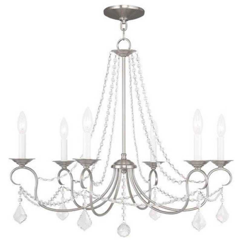 This intricately accented and masterfully forged six light chandelier is from the Pennington collection. Finish is a brushed nickel and features include gracefully sculpted arms and with sparkling clear crystal. -Finish: Brushed Nickel -Material: Steel -Nu