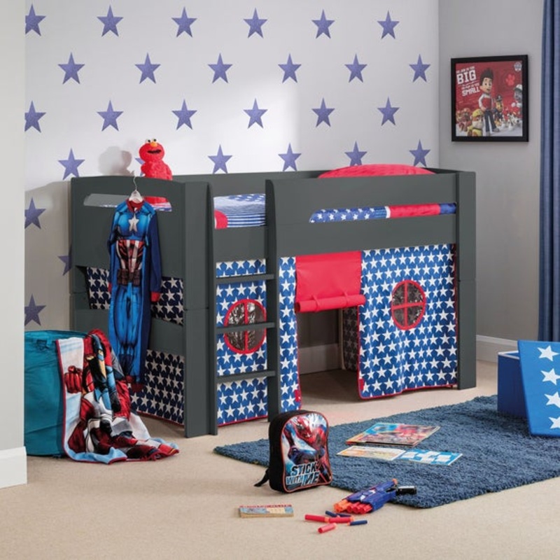 Kids bed frame with tentPluto star tent creates a fun and vibrant play spaceSturdy and stylish mid-sleeperSolid slatted baseRobust ladder can be left or right hand facingVersatile - Can be converted to a single bed if requiredSmooth lacquer finishTake your