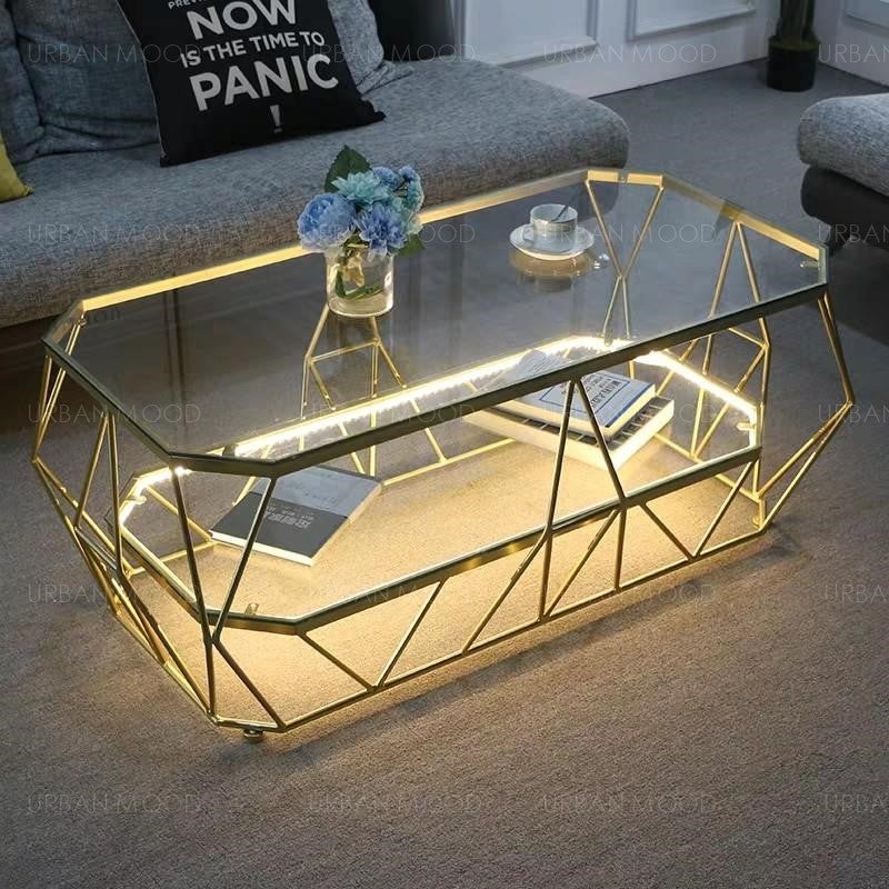 POLYGON Modern Geometric Glass Gold Coffee Table with Light