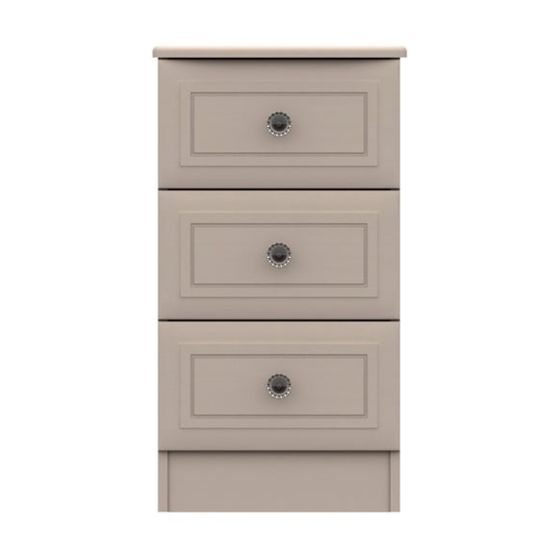Finished in a choice of white and fired earth melamine finishes, the Portia 3 Drawer Bedside Table offers a stunning timeless design, perfect for enhancing any bedroom space. This stylish bedside unit offers a traditional styling, with its elegant bevelled edge profile drawer fronts with beautiful crystal look handles. Supplied fully assembled for convenience, the Portia comes with three spacious drawers, complete with 8mm heavy duty bases, linen look insides and easy glide metal runners.