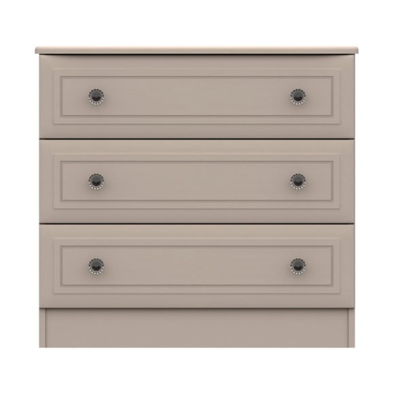 The Portia 3 Drawer Chest offers a stunning timeless design, perfect for enhancing any bedroom space. This stylish chest of drawers offers a traditional styling, with its elegant bevelled edge profile drawer fronts with beautiful crystal look handles. Supplied fully assembled for convenience, the Portia comes with three spacious drawers, complete with 8mm heavy duty bases, linen look insides and easy glide metal runners.