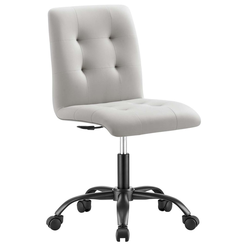 Etiquette presides over the properly styled Prim Armless Office Chair. Modern and luxurious, this swivel office chair features deep biscuit tufting, durable vegan leather upholstery, and elegant piped trim for added finesse. This vegan leather office chair is height adjustable, features a 360 swivel, and comes outfitted with a matte black metal base with five dual-wheel nylon casters. Perfect for conference rooms, workstations, desks, or college dorm rooms, Prim is complete with dense foam padding for lasting comfort throughout the workday. Assembly required. Weight Capacity: 287 lbs.