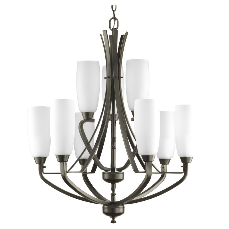 Nine-light, two-tier chandelier is characterized by its unique tulip-shaped glass shades and bold, sculptural design. Rectangular arms flow through the fixture and consist of strap accents. Etched white glass brings out the beauty for this Antique Bronze fixture while also providing ideal illumination. Wisten Collection can be used to update a single room or an entire home to create a designer coordinated look.
