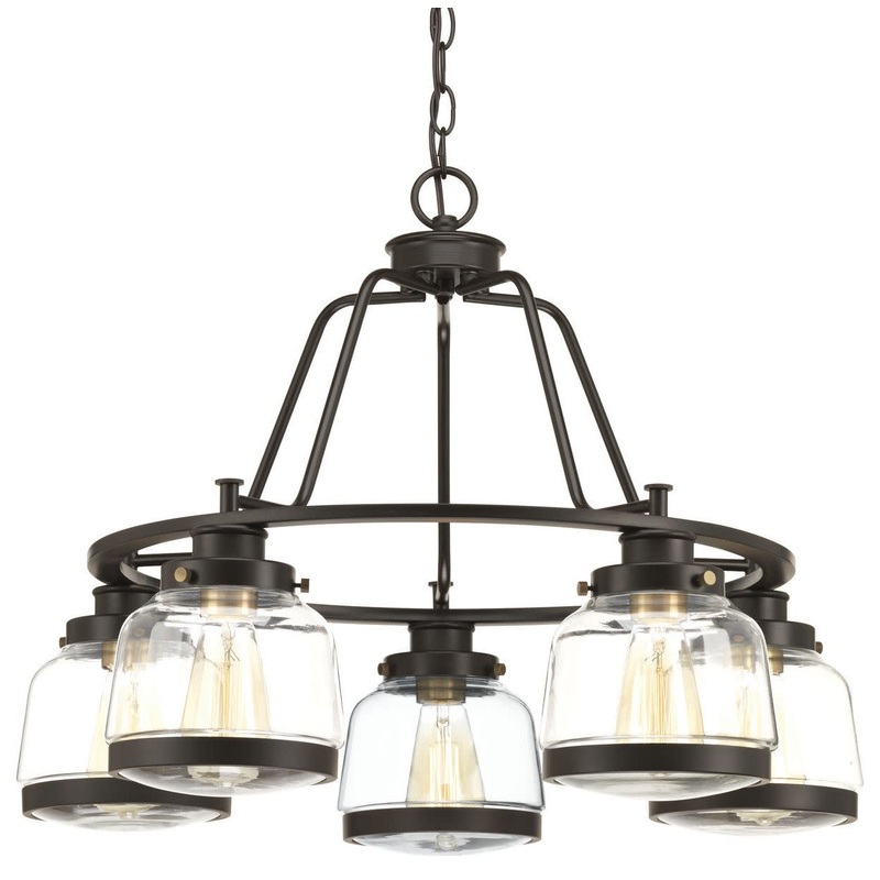 Features Steel construction Includes glass shades Sloped ceiling compatible (5) 75 watt maximum medium (E26) bulbs required 72″ of adjustable chain included Recommended for use with Vintage Edison bulbs Can be dimmed with dimmable bulbs UL and CUL rated for dry locations Covered under a 1 year limited manufacturer warranty Dimensions Fixture Height: 19-1/4″ Maximum Hanging Height: 92-1/2″ Width: 26″ Depth: 26″ Product Weight: 13.35 lbs Chain Length: 72″ Wire Length: 180″ Shade Height: 5-1/4″ Shade Width: 6-1/2″ Shade Depth: 6-1/2″ Canopy Height: 3/4″ Canopy Width: 5″ Canopy Depth: 5″ Electrical Specifications Max Wattage: 375 watts Number of Bulbs: 5 Max Watts Per Bulb: 75 watts Bulb Base: Medium (E26) Bulb Shape: A19 Bulbs Included: No