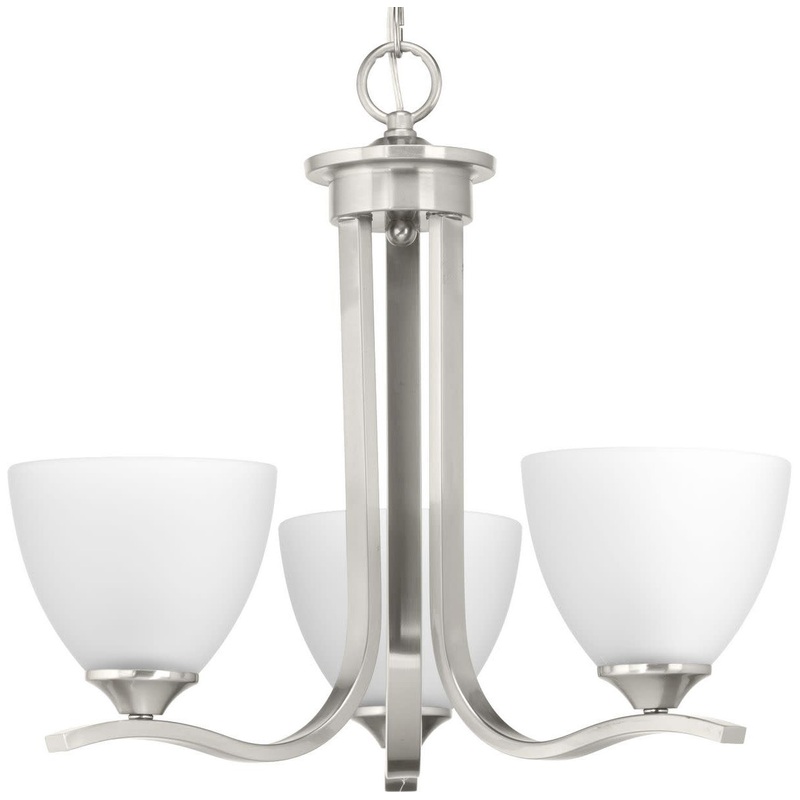 Features Steel construction Includes glass shades Sloped ceiling compatible (3) 100 watt maximum medium (E26) bulbs required 42″ of adjustable chain included Can be dimmed with dimmable bulbs UL and CUL rated for dry locations Covered under a 1 year limited manufacturer warranty Dimensions Fixture Height: 16″ Maximum Hanging Height: 60″ Width: 19-3/4″ Depth: 19-3/4″ Product Weight: 7.28 lbs Chain Length: 42″ Wire Length: 96″ Shade Height: 4-3/4″ Shade Width: 5-3/4″ Shade Depth: 5-3/4″ Canopy Height: 1″ Canopy Width: 5-1/8″ Canopy Depth: 5-1/8″ Electrical Specifications Max Wattage: 300 watts Number of Bulbs: 3 Max Watts Per Bulb: 100 watts Bulb Base: Medium (E26) Bulb Shape: A19 Bulbs Included: No