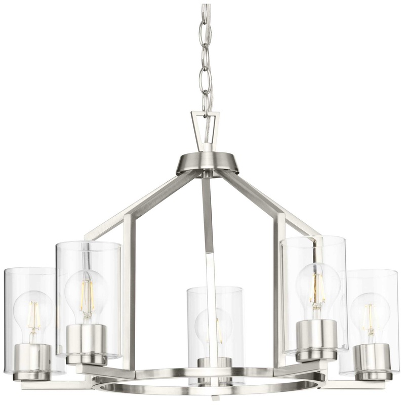 The Goodwin Chandelier features a clean design that seamlessly blends with today’s modern decor. Angular, crisp lines highlight the frames modern profile. Columns of glass shades offer bright illumination for bedrooms, dining rooms and living rooms in modern farmhouse settings. Features: Goodwin features a clean design that is ideal for dining rooms, foyers, bedrooms, living rooms, and laundry rooms Includes 48 inches of chain for a variety of ceiling heights and can be used on a sloped ceiling Includes installation instructions and mounting hardware for a quick, easy installation Constructed from steel Can be installed on vaulted ceilings Comes with 48″ hanging chain Requires (5) 12 watt medium (E26) bulbs Capable of being dimmed Rated for installation in dry locations Dimensions: Height: 15-1/2″ Maximum Height: 66-1/2″ Width: 24″ Depth: 24″ Wire Length: 96″ Chain Length: 48″ Electrical Specifications: Max Wattage: 60 watts Number of Bulbs: 5 Watts Per Bulb: 12 watts Bulb Base: Medium (E26)