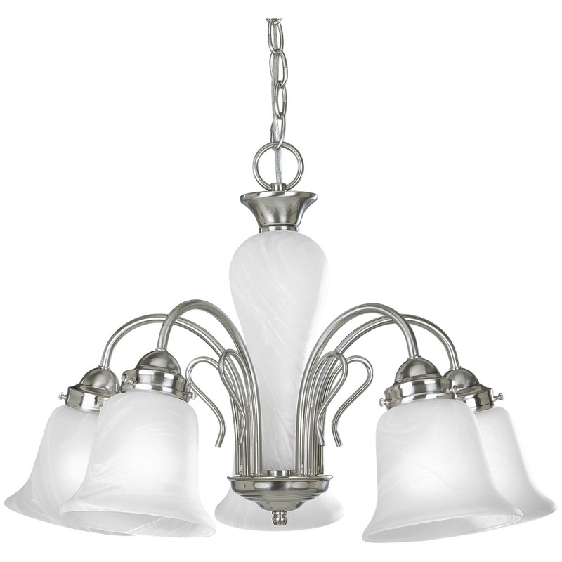 -Five-light chandelier with etched alabaster glass shades and center column -Finish: Brushed Nickel -Bulb Type: Uses Medium Base -Bulb Wattage: 100 -Bulb Quantity: 5 -Listed: Dry location listed -Mount Type: Ceiling Chain -Style: Traditional/Casual -Featur