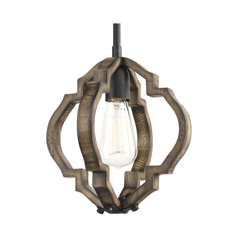 The statement-making one-light Spicewood mini-pendant features a rich, solid wood surrounded in a classic quatrefoil pattern. Wrought iron metal fittings in a Gilded Iron finish are paired with a distressed pine frame to complement rustic and reclaimed des
