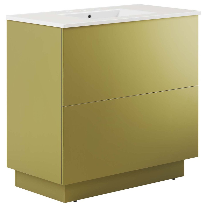 Experience a harmonious blend of luxury and practicality with the Quantum 36" Bathroom Vanity. This modern bathroom vanity features a sleek ceramic sink basin with 8" centerset holes and integrated countertop, awaiting your personalized fixture choices (no