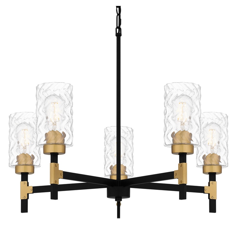 The Carly collection radiates style and sophistication. A sculptural design is paired with aged brass accents for a touch of industrial styling. Clear swirl glass shades complete the look, adding a layer of luxury and drama. Choose from a mini pendant light or a chandelier in this standout collection. Features: Constructed from steel Includes clear, swirl glass shades Can be installed on vaulted ceilings Includes (2) 12″ and (2) 6″ downrods Requires (5) medium (E26) 100 watt bulbs (not included) Capable of being dimmed Recommended for use with Vintage Edison style bulbs ETL listed for damp locations Covered by Quoizel’s 1 year limited manufacturer warranty Dimensions: Height: 12″ Minimum Height: 21″ Maximum Height: 45″ Width: 28″ Depth: 28″ Product Weight: 10.34 lbs Shade Height: 6-1/2″ Shade Width: 4″ Canopy Height: 3/4″ Canopy Width: 5″ Canopy Depth: 5″ Electrical Specifications: Max Wattage: 500 watts Number of Bulbs: 5 Watts Per Bulb: 100 watts Bulb Base: Medium (E26) Voltage: 120 volts Bulbs Included: No