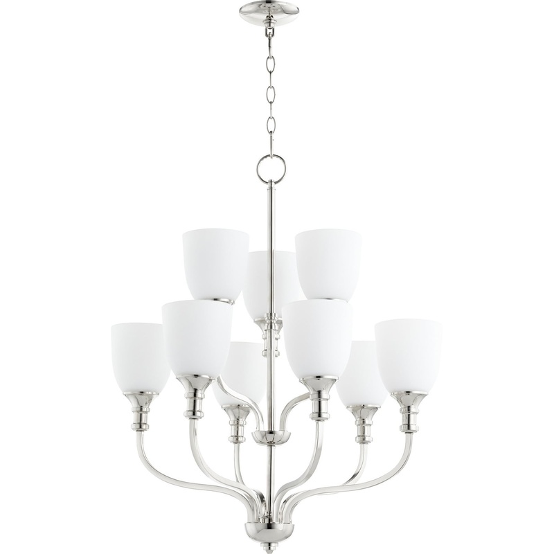 This Richmond 9-LT Chandelier from Quorum has a finish of Polished Nickel and fits in well with any Transitional style decor.