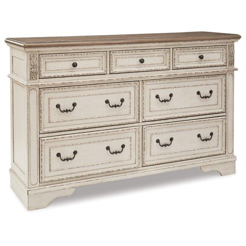 Elevating the art of traditional cottage styling, this dresser is your dream bedroom retreat realized. Its antiqued two-tone aesthetic blends a chipped white with a distressed wood finished top for added charm. Framed drawer fronts and decorative corbels add refinement, while bail pulls in a dark bronze-tone finish lend a classic touch.