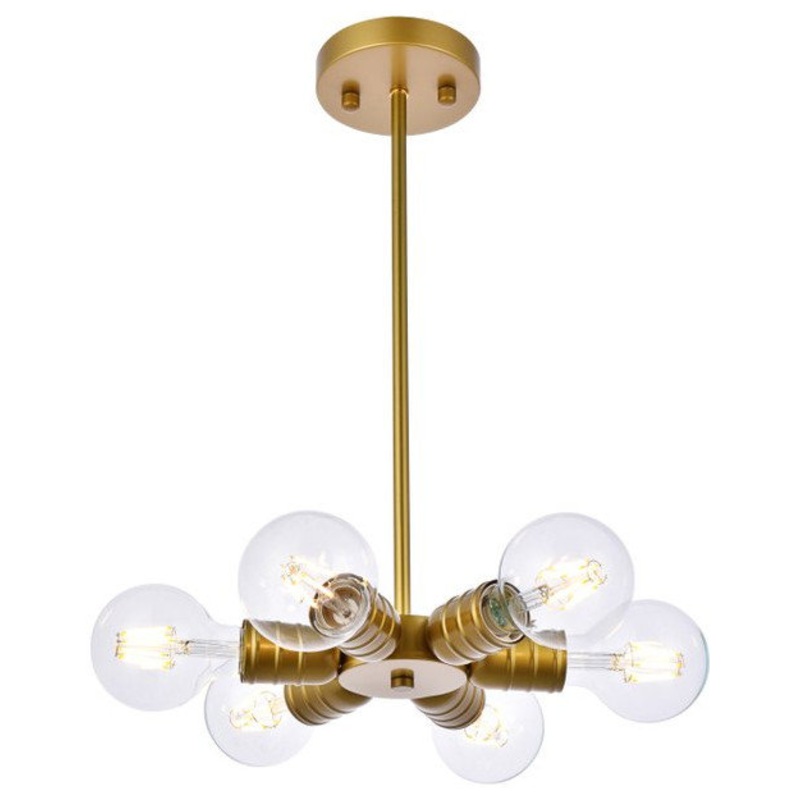This pendant lamp is a statement piece itself which marks its modern territory. This piece brightens the place up and its design is available in a brass, chrome, or black finish. This piece is chic which will compliment and complete any room. In addition the lamp is dimmable and requires three or six E26 lamps— depending on the amount of lights you want._ Light bulbs not included.