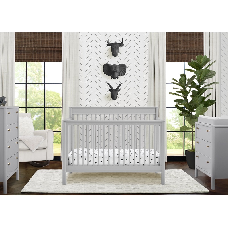 The Remy 6-in-1 Convertible Baby Crib by Delta Children will instantly elevate your nursery with its mid-century modern style. Clean lines, playful round spindles and cylindrical posts define this beautiful crib. Built to grow with your child, the Remy features an adjustable height mattress that can be lowered as baby begins to sit or stand, plus it converts from a crib to a toddler bed, daybed, sofa, and full size bed with and without footboard. Pair this crib with other pieces in the Remy Collection for a coordinated look.