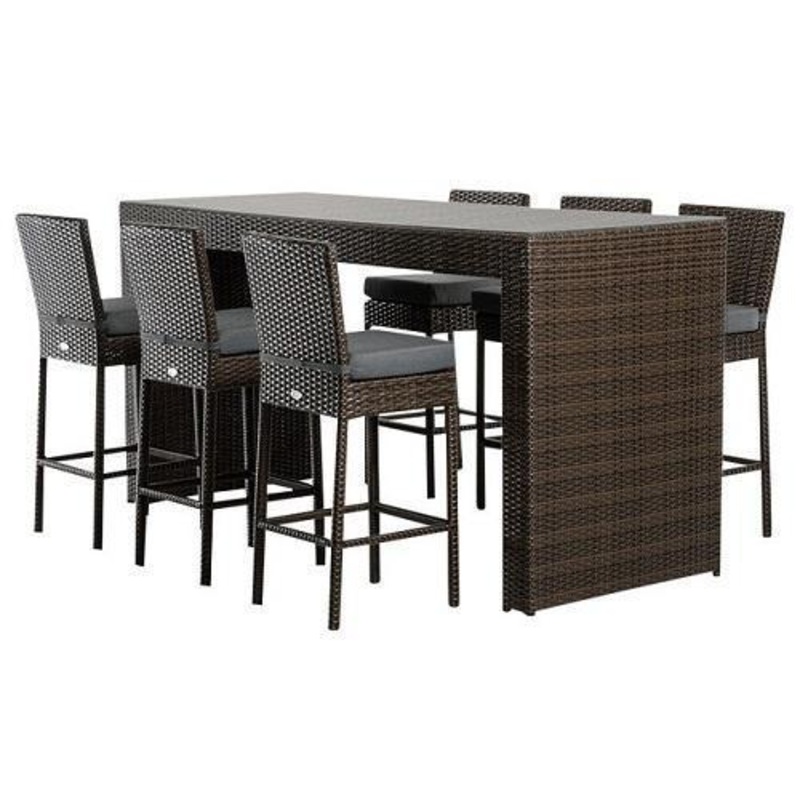 Durable brown weatherproof flat rattan covers the strong aluminium frame of the Genua Outdoor Bar Table Set. Arectangular clear glass table top provides ample space for your entertaining needs. Set includes a table, six chairs and no cushions.Table: W87" x