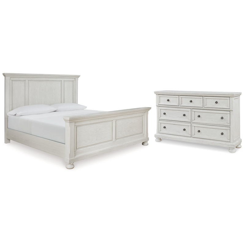 Elegant, timeless furnishings take your bedroom to the next level. Nothing does that better than this bedroom package. The antiqued white finish with a wonderful grain texture oozes sophistication, while dark bronze-tone hardware adds a sophisticated touch. Felt-finished top drawers and a hidden pull-out tray behind the top middle drawer of the dresser round out the set for the ultimate tasteful bedroom.