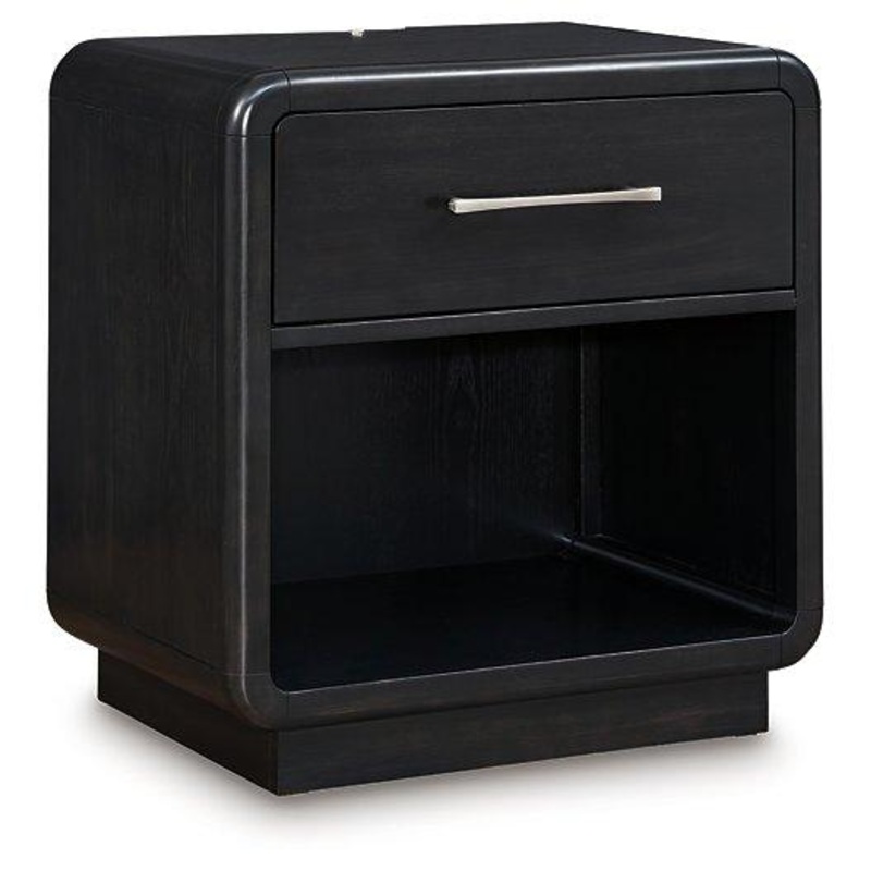 Inspired by art deco design, this softly shaped nightstand makes a lasting impression in a simply stunning way. Its magnificent curved silhouette is enhanced by a rich layered black finish on the textured wood grain surface. Complete with an LED nightlight, AC power and two USB ports, this is the statement piece youve been dreaming of to elevate your contemporary inner sanctum.