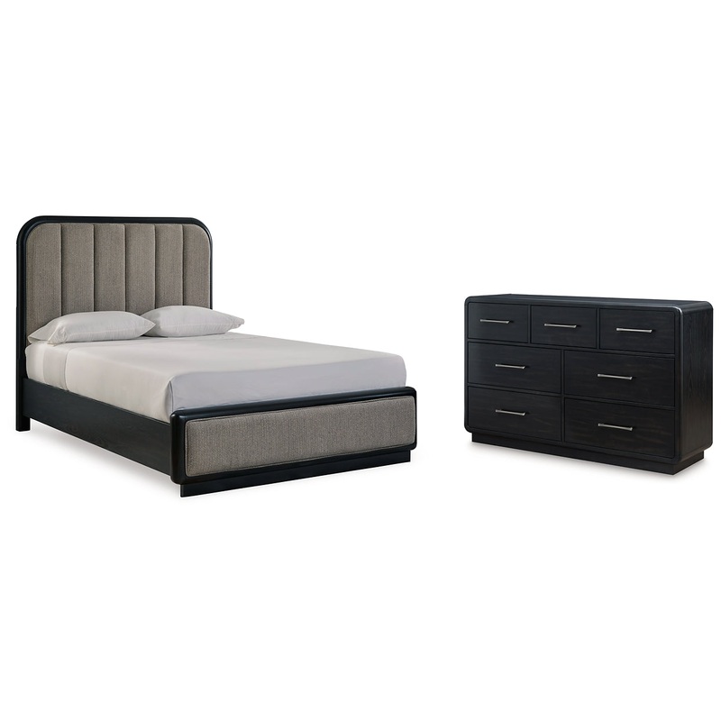 Inspired by art deco design, this softly shaped bedroom package makes a lasting impression in a simply stunning way. Magnificent curved silhouettes are enhanced by a rich layered black finish on the textured wood grain surface. These are the statement pieces youve been dreaming of to elevate your contemporary inner sanctum.