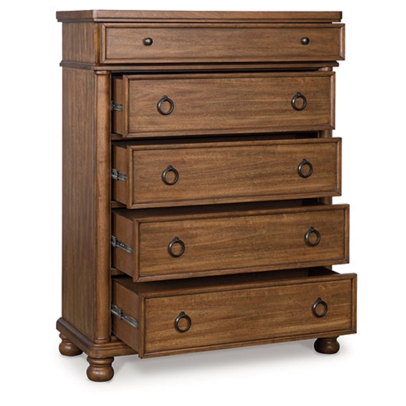 Taking a laid-back approach to casual traditional design, this artfully crafted chest of drawers combines classic elements with a clean modern approach. Its rich medium brown wood tone exudes a comfy, timeless appeal that's sure to carry you away to a drea