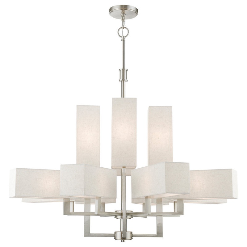 This chandelier from the Rubix collection has a crisp, clean look and contemporary appeal. The angular arms feature a brushed nickel finish. The oatmeal fabric hardback shades offers warm light for your surroundings. -Bulb Wattage: 40 -Number of Bulbs: 12