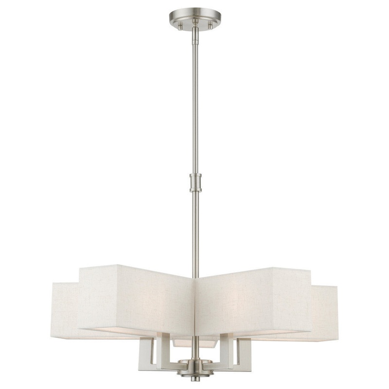 This chandelier from the Rubix collection has a crisp, clean look and contemporary appeal. The angular arms feature a brushed nickel finish. The oatmeal fabric hardback shades offers warm light for your surroundings.
