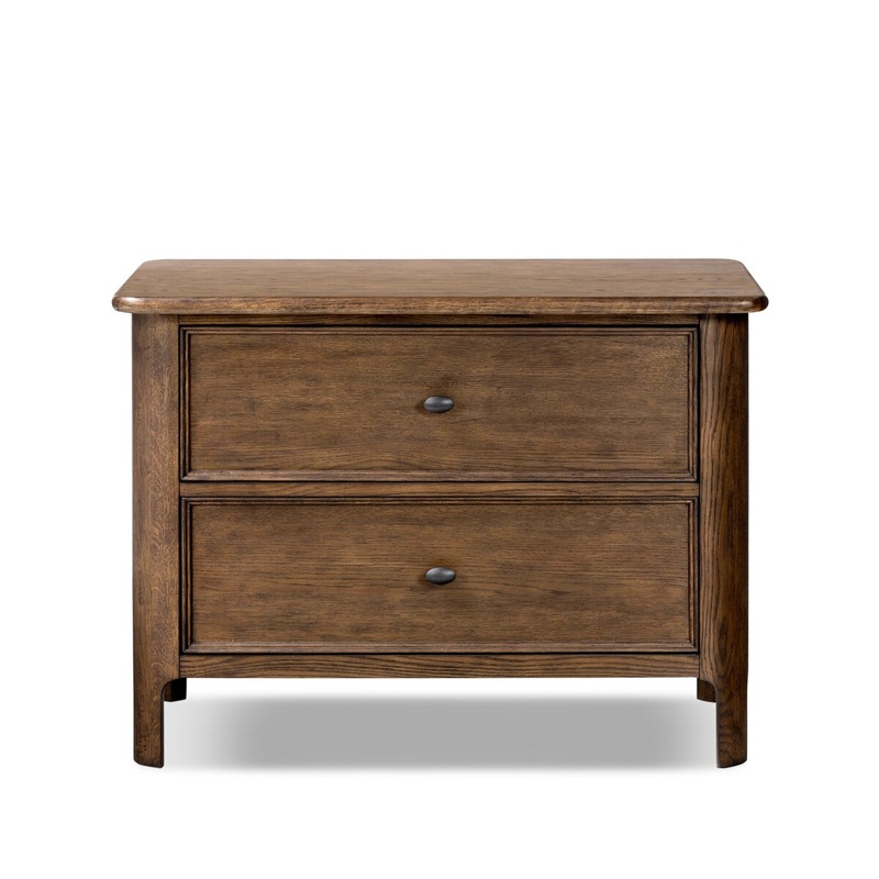 Like an heirloom nightstand with two roomy drawers, this aged oak design has room for it all. Detailed with an overhang surface, carved edges top to bottom, angled legs and oval drawer pulls finished in dark gunmetal.