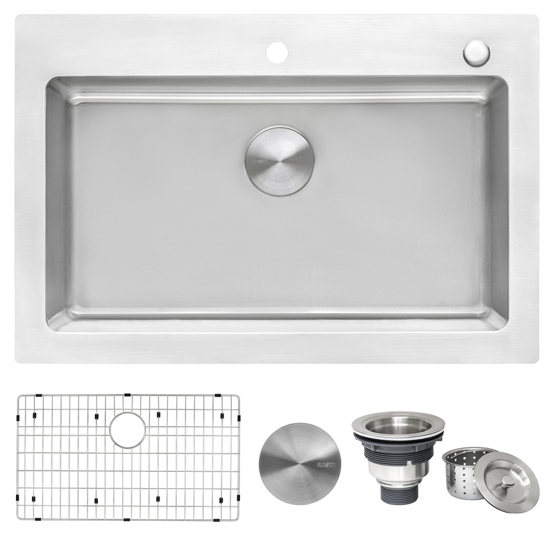 -INCLUDED IN BOX: Sink, cut-out template, mounting brackets, bottom rinse grid(s), basket strainer drain(s), decorative drain cover(s).