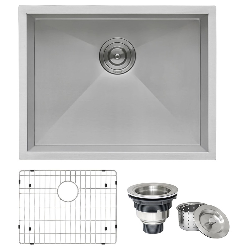 Sure to please any designer with an eye for purism, the Nesta series is defined by square bowls with sharp zero radius corners. The luxurious satin finish and heavy duty sound guard undercoating makes Nesta a perfect choice for your modern kitchen. Rear drain placement and elegant drain grooves add to the functionality of the sink. Ruvati RVH7100 Features: Constructed from stain and rust proof 16 gauge premium grade T-304 stainless steel Standard 3.5″ drain opening will fit any garbage disposal unit Rear drain location Covered under Ruvati’s limited lifetime warranty Included in box: Sink, cut-out template, mounting brackets, rinse grid, basket strainer Ruvati Technologies: Zero Radius Edges: Sharp inside corners accentuate the modern look DUALmount Installation: Rim is brushed and finished to match the inside of the sink allowing the sink to be installed in an undermount or drop-in application. Commercial Grade Finish: Easy to clean and long lasting. Unlike satin finish, Ruvati’s brushed finish masks scratches and matches well with your kitchen appliances Ruvati RVH7100 Specifications: Sink Length: 23″ (from left to right) Sink Width: 18″ (from front to back) Sink Height: 10″ (from bottom to top) Basin Dimensions: 21″ L x 16″ W x 10″ D Minimum Cabinet Size: 25″