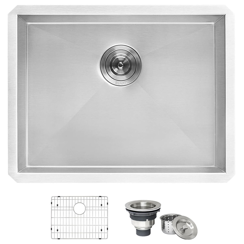 The Forma sink line from Ruvati is specially designed for your home laundry, mud room or utility room. The 12 or 13 inch bowl depth can fit large buckets, and gives you ample space to wash laundry or your boots, or anything else you need to do in a utility sink. The T-304 grade 16 gauge thick stainless steel construction makes it a heavy duty sink for your mud room. The stainless steel rinse grid protects the bottom of the sink, and allows free flow of water even when your sink is full. The basket strainer drain traps dirt and waste and can be easily lifted and emptied into your trash. With the Ruvati Forma sink bring out the true utility of your laundry or mud room. Ruvati RVU6100 Features: 12-inch deep sink: perfect as a laundry or utility sink 16 GAUGE Premium T-304 Grade Stainless Steel (18/10 Chromium/Nickel) will never rust or stain Commercial grade Brushed Finish Easy to clean and long-lasting. Unlike satin finish, our brushed-finish hides scratches and matches well with your kitchen appliances. Zero Radius sharp inside corners accentuate the modern look Standard 3.5 drain opening will fit any garbage disposal unit. Included in box: Sink, cut-out template, rinse grid, basket strainer, mounting brackets Ruvati Limited Lifetime Warranty Ruvati Technologies: Zero Radius Edges: Sharp inside corners accentuate the modern look Ruvati RVU6100 Specifications: Sink Length: 23″ (from left to right) Sink Width: 18″ (from front to back) Sink Height: 12″ (from bottom to top) Basin Dimensions: 21″ L x 16″ W x 12″ D Minimum Cabinet Size: 25″