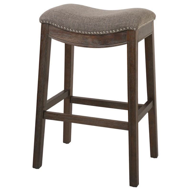 NewRidge Home Saddle Style 30″ Bar Height Stool with Cobble FabricThe NewRidge Home Saddle Bar Stool has a comfortably upholstered seat articulated with antique nailhead accents that are hand applied. The subtly contoured saddle is atop a beautifully finished solid wood frame. Solid wooden furniture is durable, sturdy and timeless.
