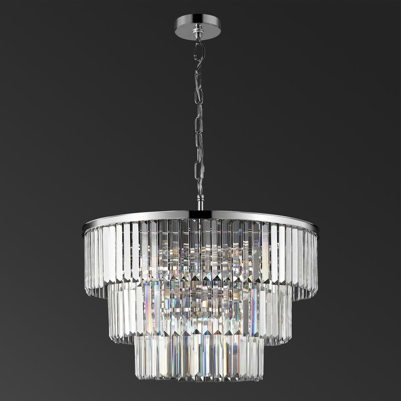 This captivating Karissa Chandelier brings undeniable star quality to your decor, making it a must-have for celebrity-chic interiors. Flaunting two cascading tiers of elongated crystal prisms beneath a sleek nickel-finished crown, Karissa's unapologetic Ol
