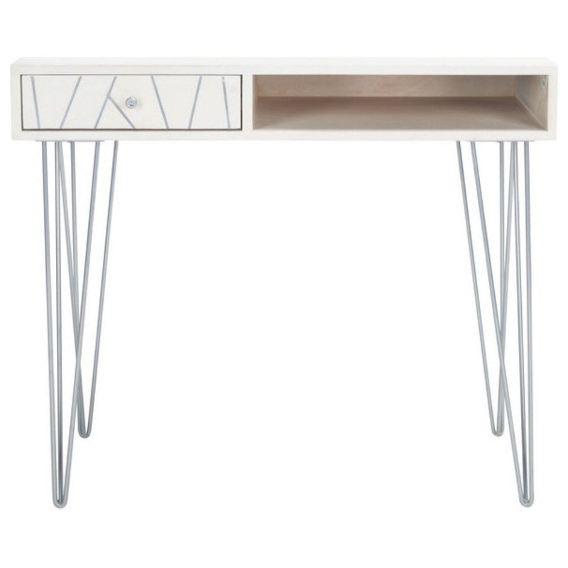 Elevate the home office to new heights of decorative drama with this Marigold Desk. Featuring sleek silver hairpin legs that beautifully pair with the matching inlay and pull on its drawer, Marigold's artful asymmetry and retro inspiration give any interio