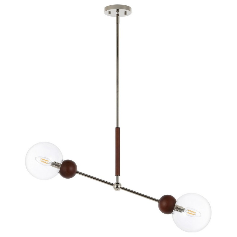 Make a refined and sleek statement with our Rocky extendable pendant. The crisp lines and minimalistic profile of our pendant light make it a chic addition to any room. It beautifully highlights the round clear glass shades, creating a stunning display of each bulb. Completed with an elegant combo of dark walnut wood and nickel finish, our pendant serves as a sophisticated focal point for any room. It features a low profile and can be positioned in multiple directions to illuminate your entryway, dining area, kitchen, or lounge to perfection.