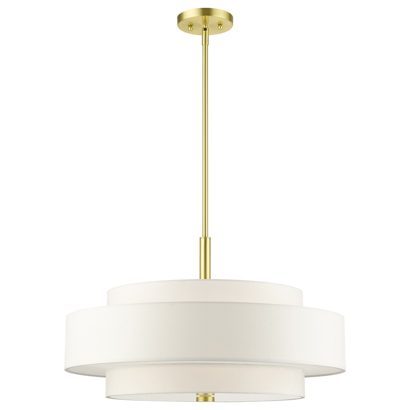 The Meridian collection has a clean, crisp look and contemporary appeal. The hand-crafted off-white fabric hardback shades offer a diffused warm light. This five-light multi-tier drum shade adds character to this handsomely styled pendant chandelier. Will adapt well in the living room, dining room or in the bedroom tastefully elevating your style. This sleek design is shown in a satin brass finish.