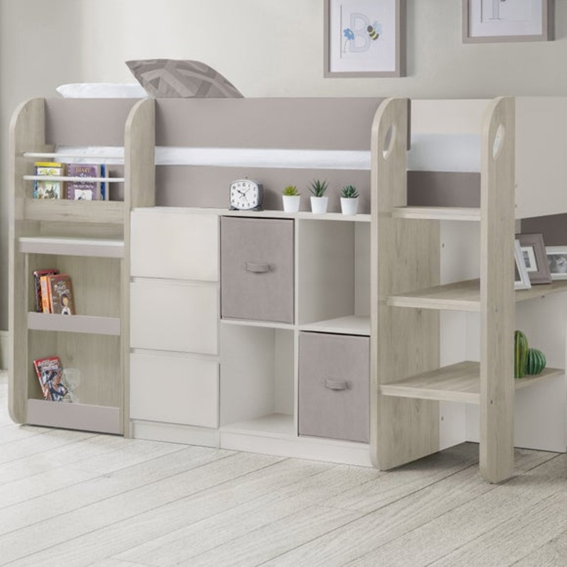 Includes bookcase, 3 drawer chest, and cube bookcaseMade with sturdy particleboardAccepts a Standard UK Single MattressFor a space-saving solution that offers more than just a bed, look no further than the Saturn Midsleeper. With its stylish taupe finish a