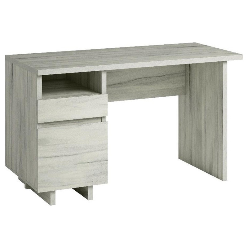 Creating a stylish home office has never been easier. Get motivated to tackle all your big projects when you add the modern style and storage of this single pedestal desk from the Porto Palma collection. This home office desk with drawers offers a spacious, 1″ thick top surface that provides you with the room you need for items like your laptop, stacks of notepads, folders, and even a little home dcor too. A small storage drawer opens and closes on smooth metal runners for easy access to items like envelopes and stamps, or pens and sticky notes. The large lower drawer of this desk with open storage features full extension slides and holds letter-size hanging files for increased organization. Need more storage? The open cubbyhole area provides a space for easy storage of miscellaneous supplies. Finished on all sides for versatile placement, this desk will look great from every angle. A Haze Acacia finish makes this contemporary pedestal desk a step above the rest.