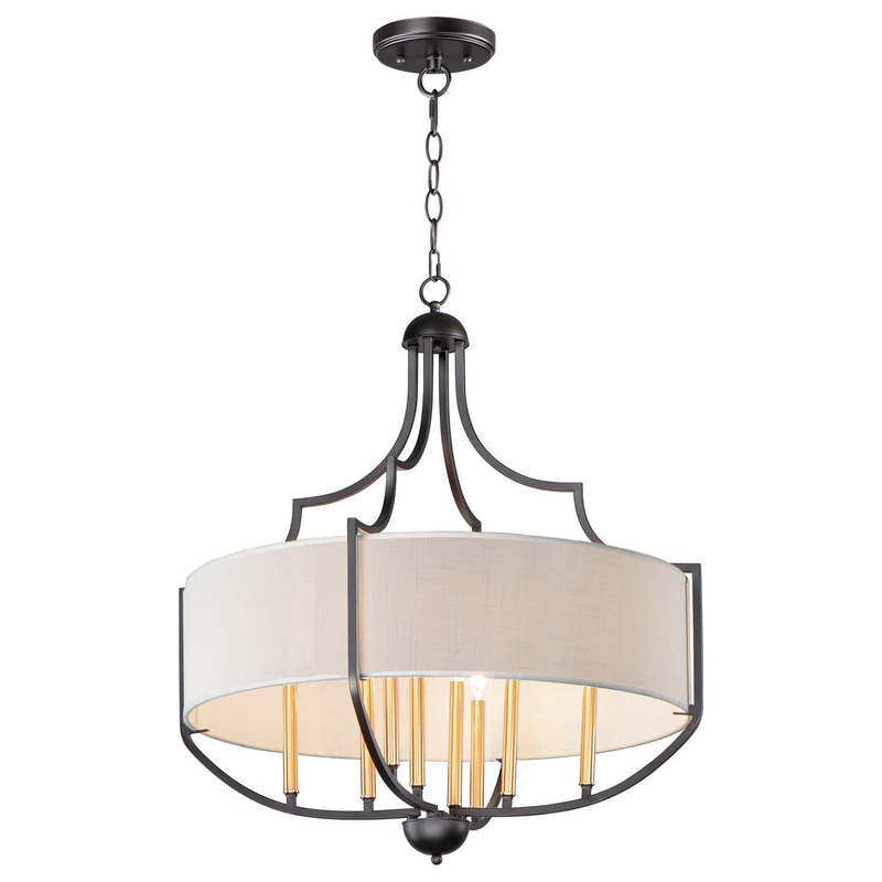 Drum shades of White Linen with an off-white liner are cradled in sculptural frames of Bronze with Antique Brass candle sleeves. The combination of finishes textures and materials provide a traditional look with depth and freshness. -Number of Bulbs: 8 -Bu
