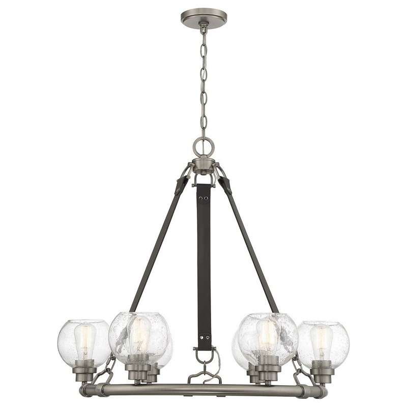 This Savoy House Bozeman 6-light chandelier brings a touch of refined, equestrian-inspired style to your home. A wagon wheel structure is adorned with round shades of seeded glass and straps of charcoal leather that pair perfectly with the antique nickel f