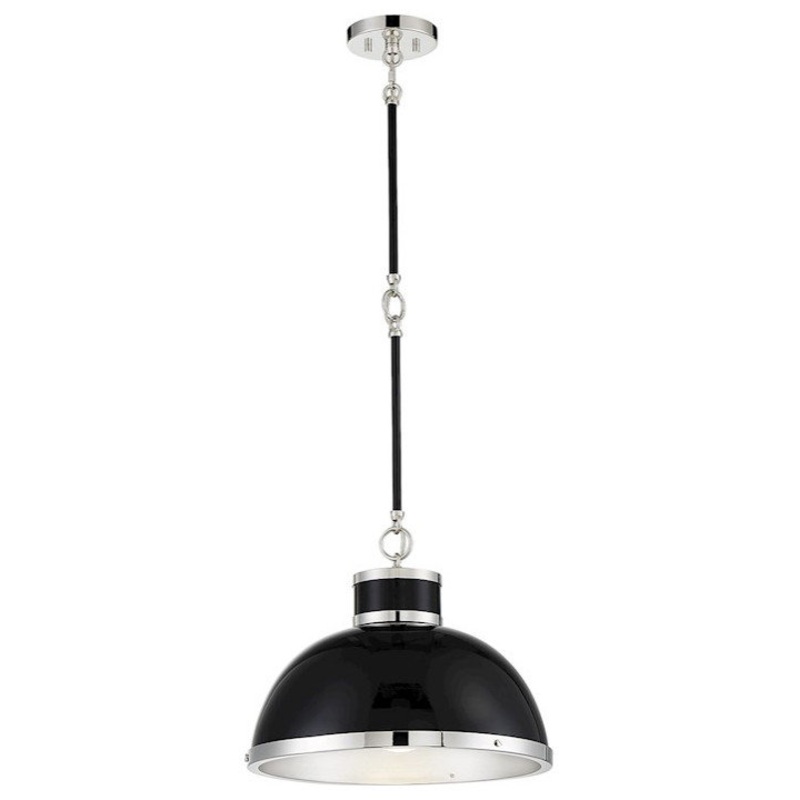 Industrial meets fashion with the Corning Collection. With an adjustable height from 11″ to 41″ and measuring 16″ wide, this stylish one-light pendant has a dramatic look with its Black finish with Polished Nickel accents. It provides ample illumination from one 60-watt Edison-base bulb.