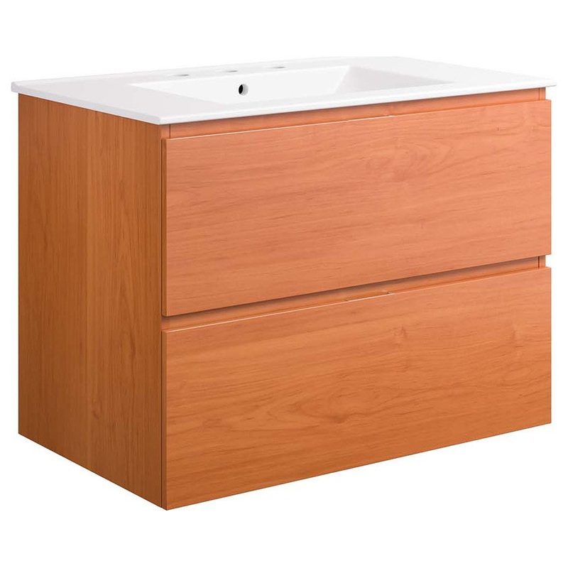 Streamlined design takes center stage in your bathroom with the Scenic 30″ Wall-Mount Bathroom Vanity Cabinet. Boasting clean lines and modern style, this bathroom vanity is crafted with melamine and features a beautiful wood grain finish that incorporates natural aesthetics. This vanity is a complete addition to the bathroom with a ceramic sink basin with an integrated countertop and 8″ centerset holes. Mounting directly to the wall with a drywall-friendly metal cleat, this vanity cabinet offers ample storage space for bathroom essentials in two full-extension drawers. Fixtures not included. Assembly required.