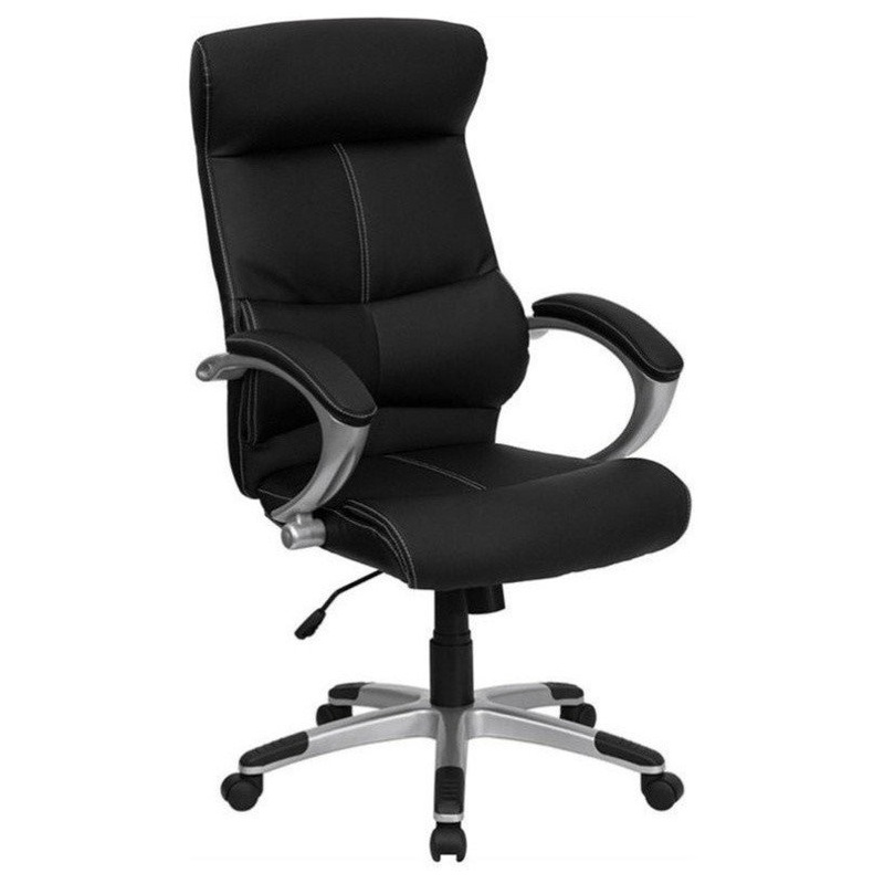 This Black High Back Executive Office Chair features soft leather upholstery with baseball glove stitching. with built-in lumbar support, a well-padded seat and back, and padded loop arms this is sure to bring a stylish addition to your office. Chair features a silver nylon base with black caps that prevent feet from slipping. []