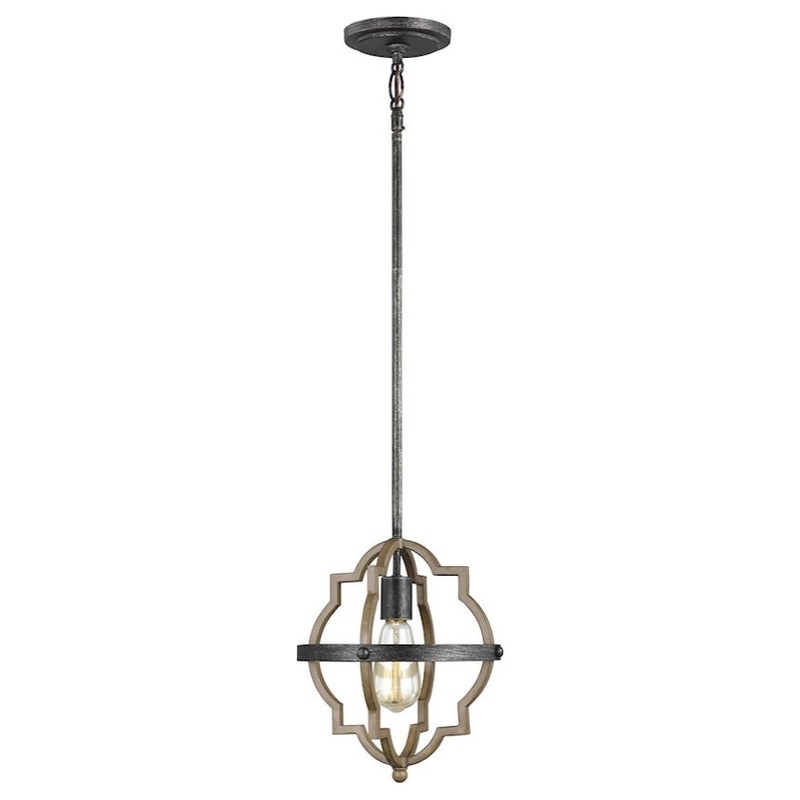 The Sea Gull Collection Socorro one light mini pendant in stardust supplies ample lighting for your daily needs, while adding a layer of today’s style to your home’s d”cor. The transitional Socorro lighting collection by Sea Gull Collection features a classic, barbed Quatrefoil profile – wholly updated by combining a distressed Cerused Oak finish on the decorative silhouette with the rich Stardust finish on the metal bobeches and decorative strapping to create undeniable rustic charm. While still offered in its original finish Stardust, the Socorro has been beautifully updated with our popular Washed Pine and Chrome finish to offer a modern take on this timeless industrial beauty. The collection includes a four-light mini-chandelier, medium and large six-light chandeliers, and four-light and six-light hall / foyer pendants. Incandescent candelabra base lamping.