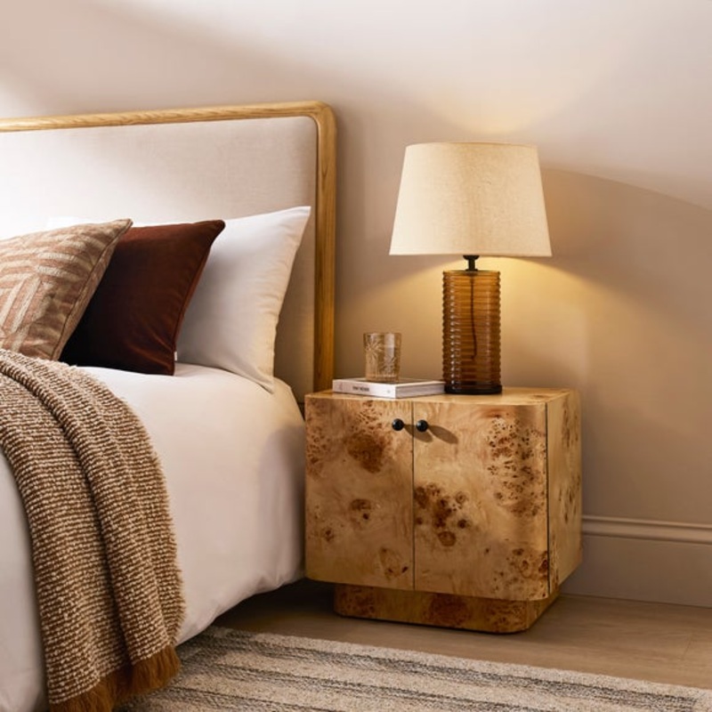 The Seana bedside table is a striking piece that brings texture and character to your bedroom. Featuring a beautiful burl wood effect and softly curved front edges, it offers a unique and luxurious look that stands out while still feeling refined. Behind the two doors lies a practical storage space for books, chargers, or other essentials, making it as functional as it is stylish.