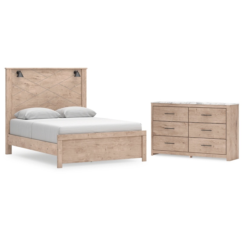 Cool, clean and casually modern. This bedroom packages light natural finish and faux Calcutta marble tops set the tone for your calming sanctuary. Large linear drawer pulls add dimension and authenticity, while the abstract headboard design brings a fresh